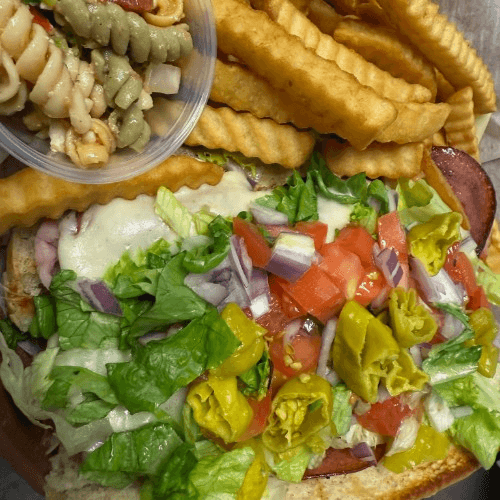 Served hot or cold. Salami, ham, provolone, tomato vinaigrette dressing, onion, pepperoncini, lettuce and tomato