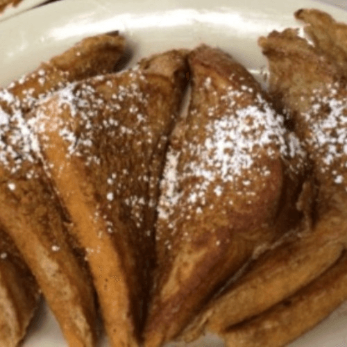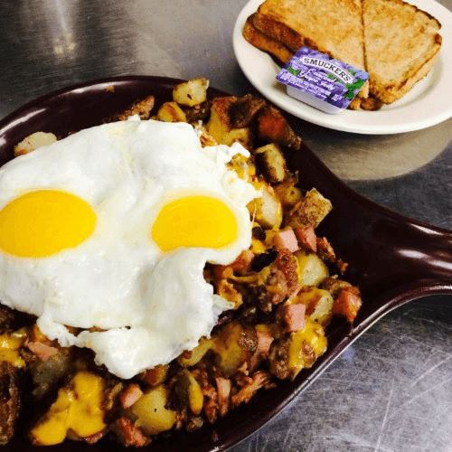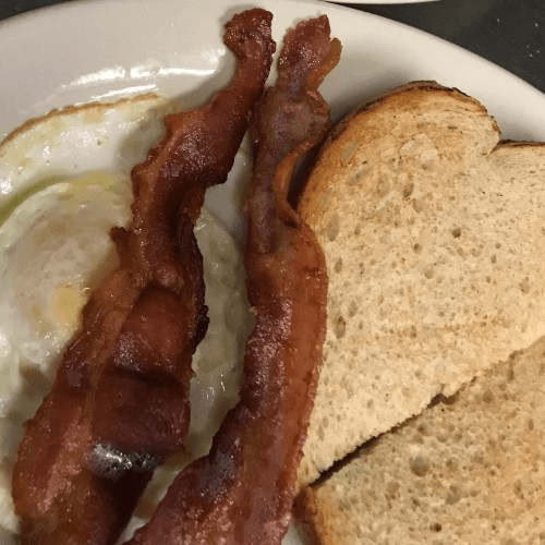 2 eggs scrambled, choice of bacon, sausage or ham, American cheese, on grilled Texas toast
