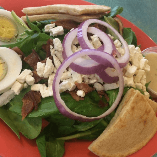 Baby spinach. Feta, bacon, red onion and a hard boiled egg with honey mustard dressing and a grilled pita