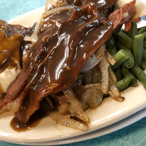 Grilled calves liver and grilled onions with your choice of potato, green beans and beef gravy