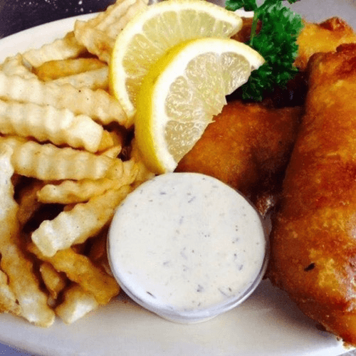 Hand beer battered cod with crinkle cut fries and our homemade tartar sauce