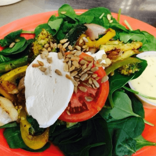 Roasted zucchini, yellow squash, red onion, cauliflower, broccoli, carrots, asparagus and red pepper with buffalo mozzarella, tomato and sunflower seeds over spinach with honey mustard dressing