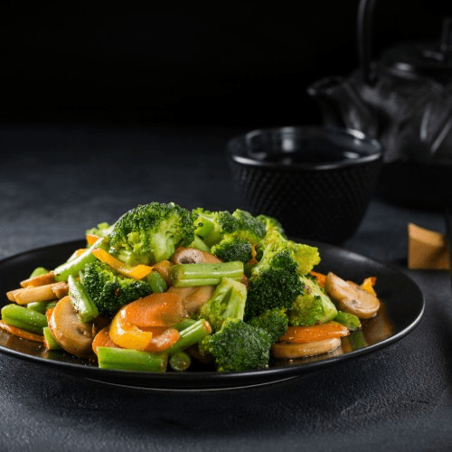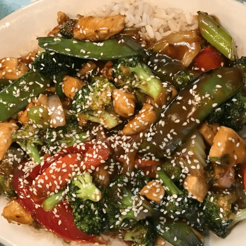 A blend of fresh broccoli, pea pods, red peppers, onions, celery and carrots stir fried with our teriyaki sauce on a bed of rice with sesame seeds