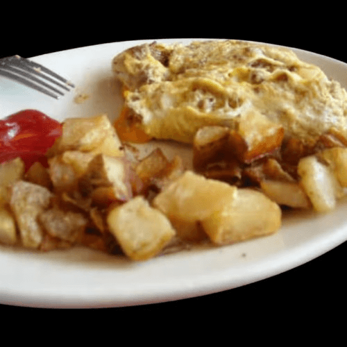 Bacon, onion, tomato, home fries, sour cream and Cheddar