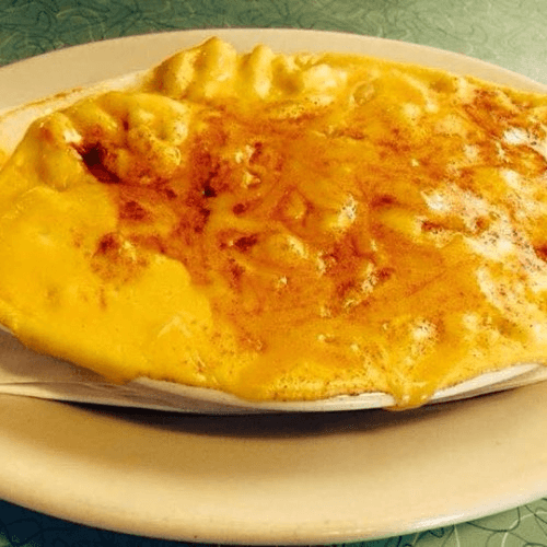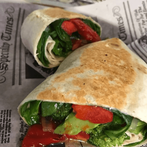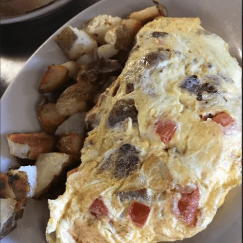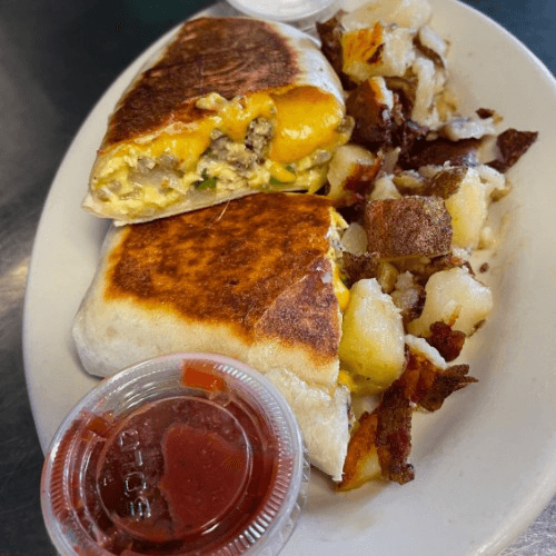 3 eggs scrambled with sausage, onions, green pepper and cheddar, rolled in a flour tortilla, grill-pressed, served with home fries, sour cream and salsa
