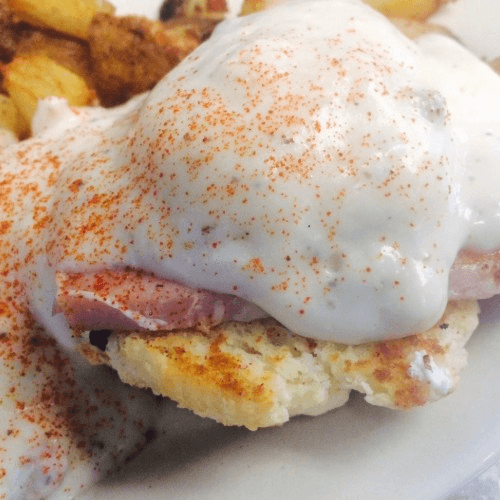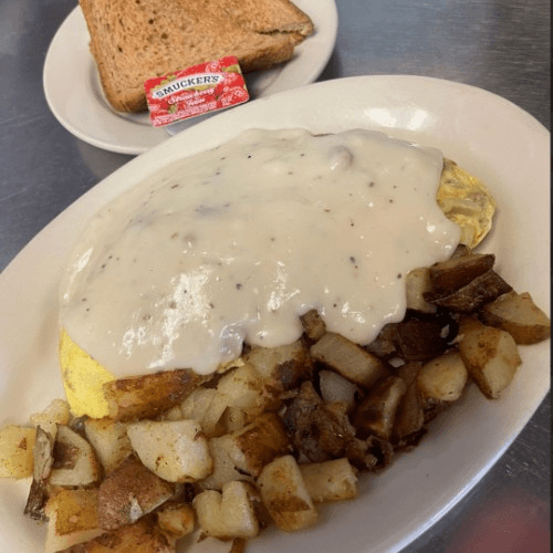 Bacon, sausage, Cheddar, topped with sausage gravy