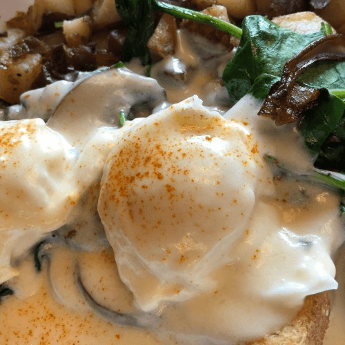 Grilled salmon, Texas toast, cream cheese, hollandaise, capers and red onion