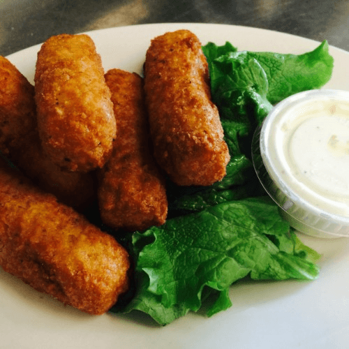 Creamy mozzarella sticks covered in a seasoned breading, served with ranch