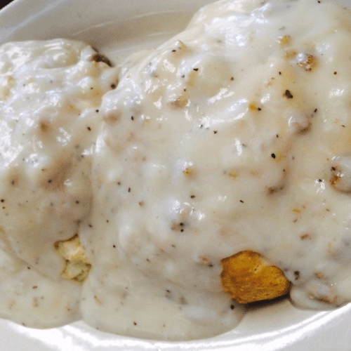 Sausage, biscuit, grilled peppers and onions, sausage gravy