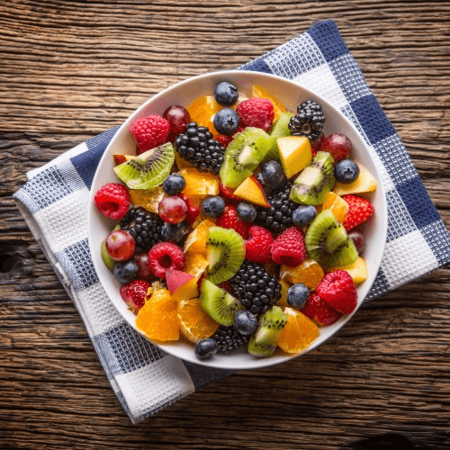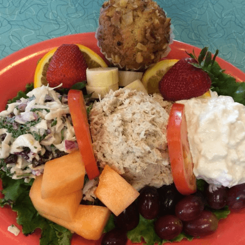 Includes a scoop of coleslaw, cottage cheese and fresh fruit with a live forever" muffin