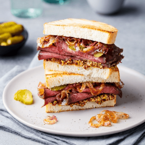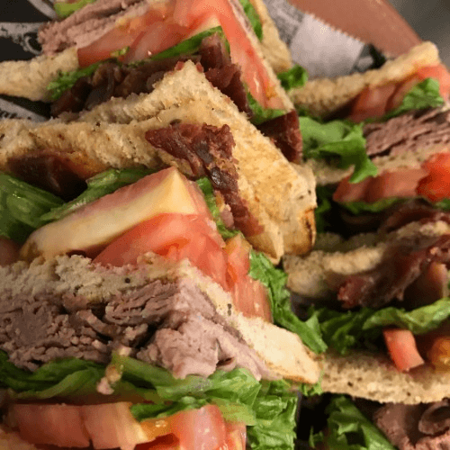 Roast beef, bacon, lettuce, tomato, horseradish peppercorn sauce on rye toast