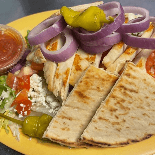 Feta cheese, tomato, red onion, pepperoncini and served with tomato vinaigrette and grilled pita. Topped with grilled chicken