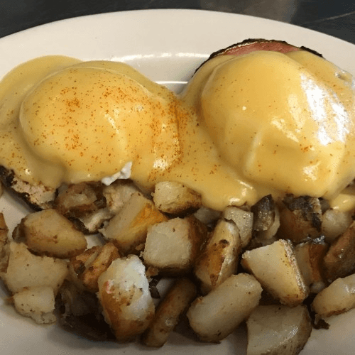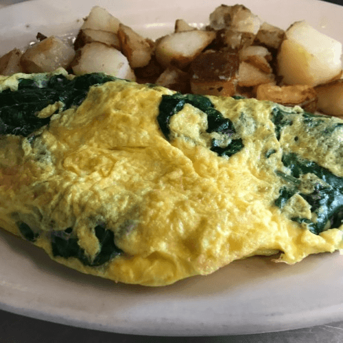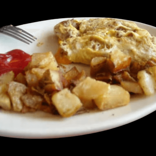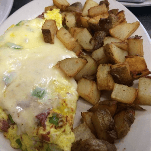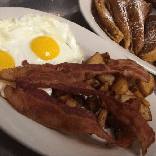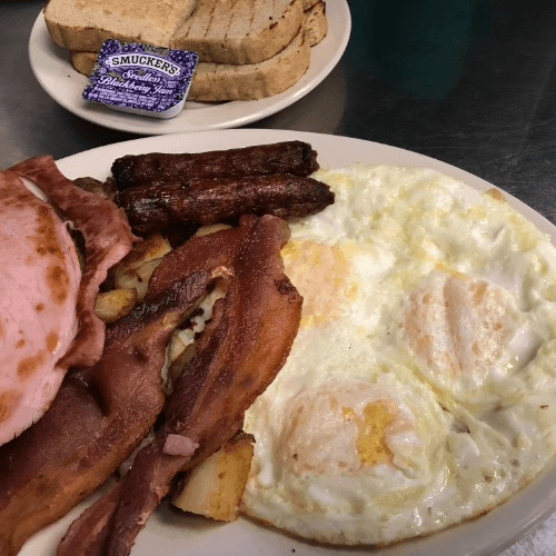 2 eggs, choice of bacon, sausage or ham, home fries and toast