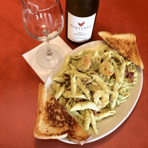 Pesto Alfredo sauce tossed with penne pasta, asparagus and bacon topped with shrimp and Parmesan cheese