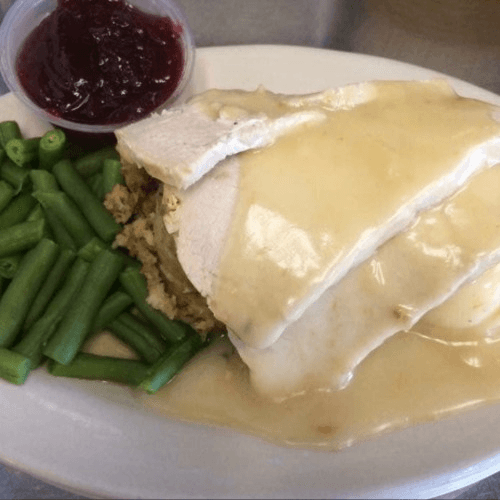 Sliced roasted turkey breast, mashed potatoes, stuffing, green beans, turkey gravy and cranberry sauce